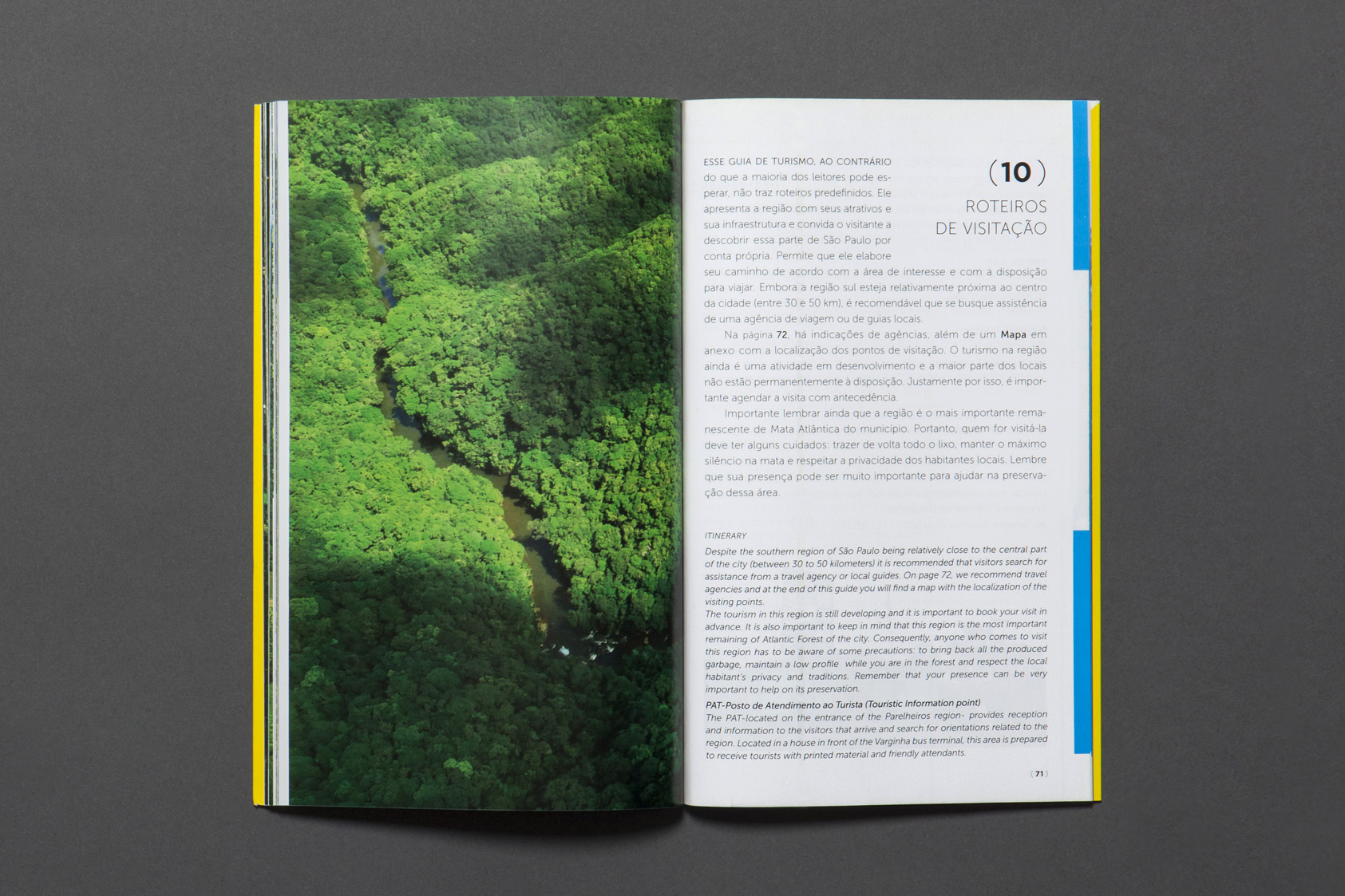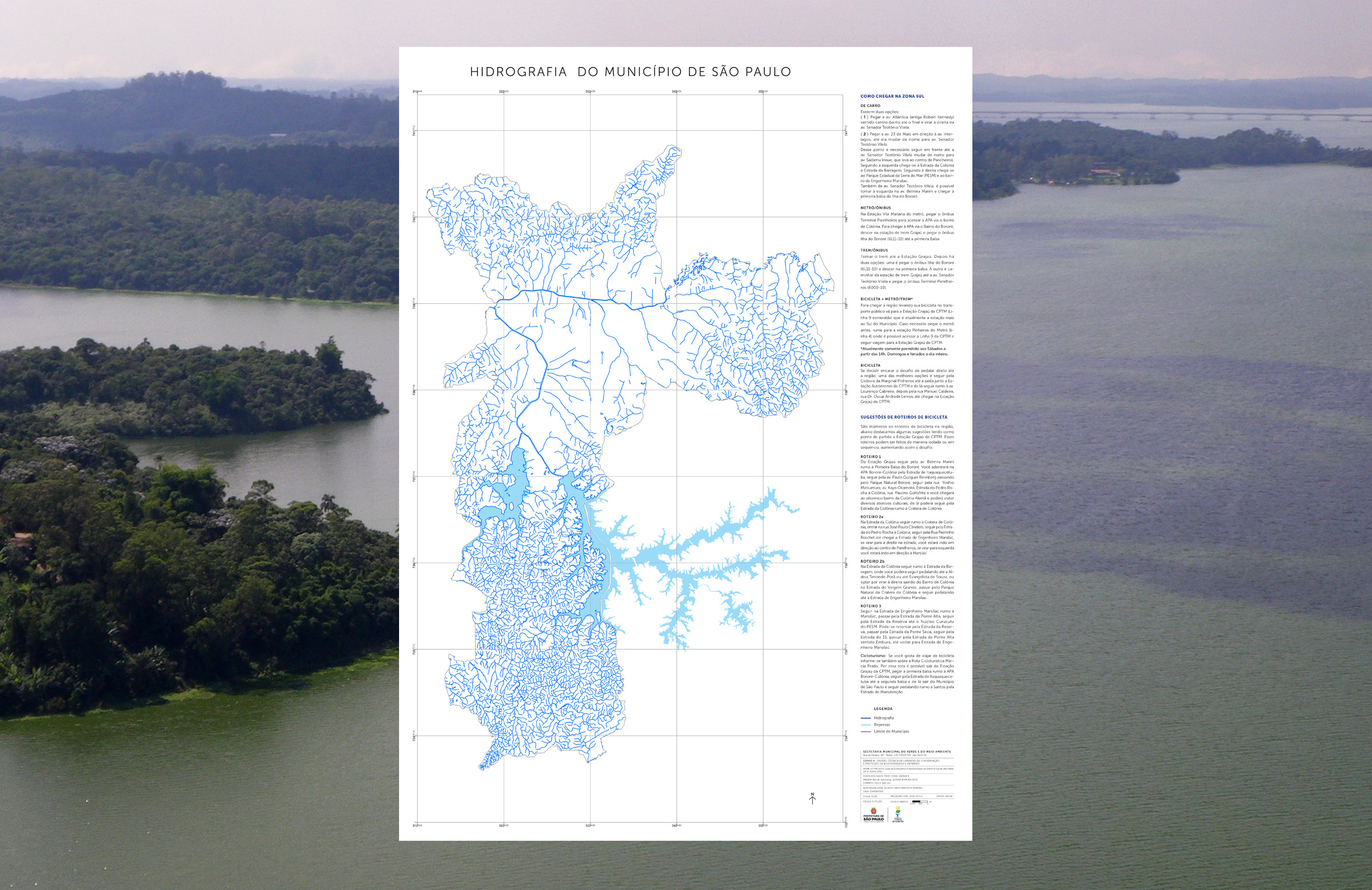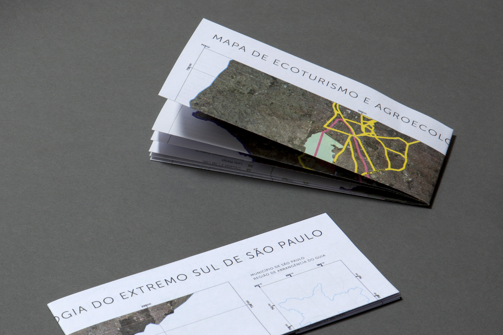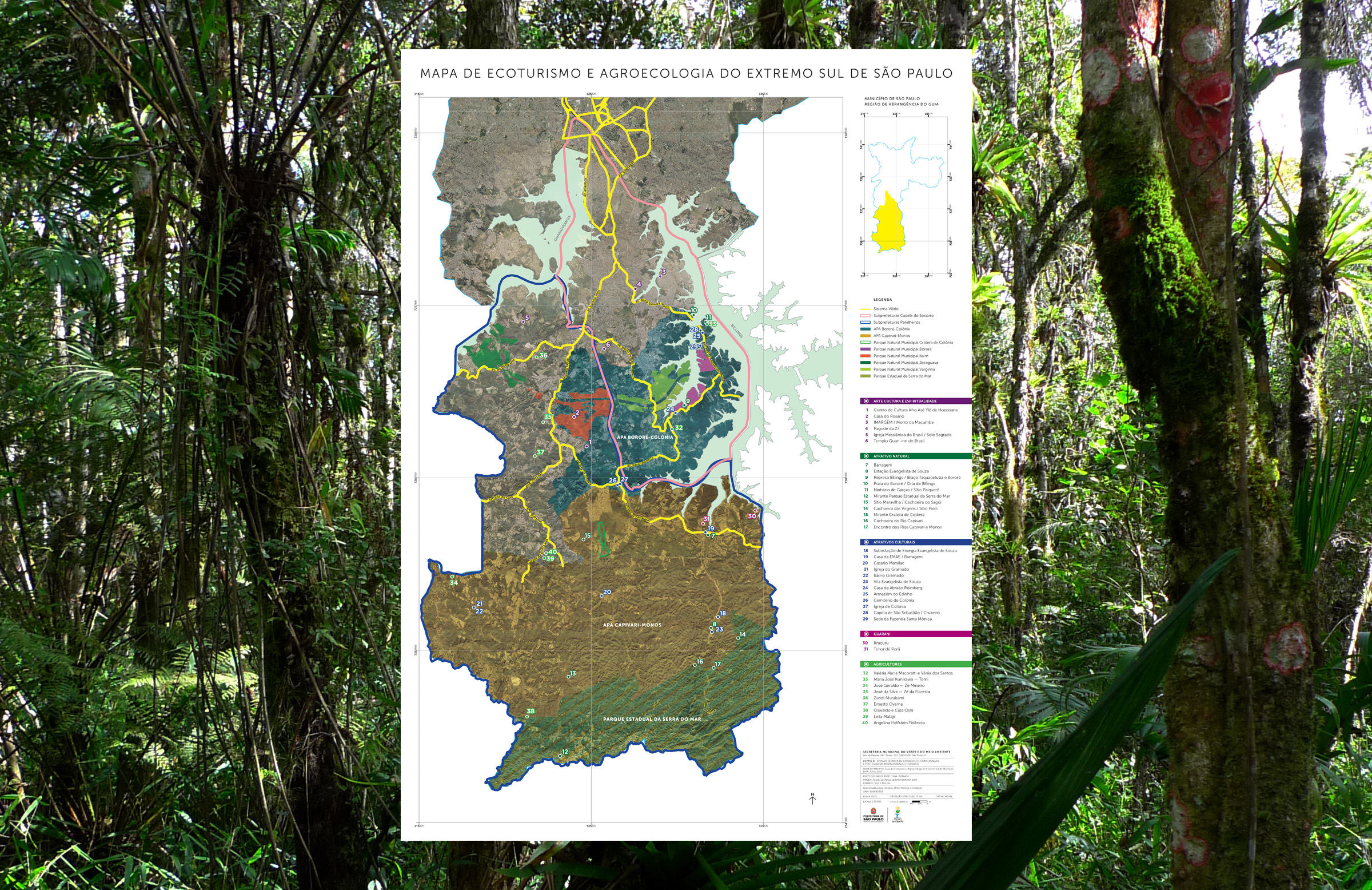 Projeto gráfico do guia turístico e mapa. O guia mostra parte das riquezas da região Sul, no município de São Paulo, sua biodiversidade, seu patrimônio histórico, a presença Guarani, as relações entre a arte, cultura e a importância da agricultura na região.
